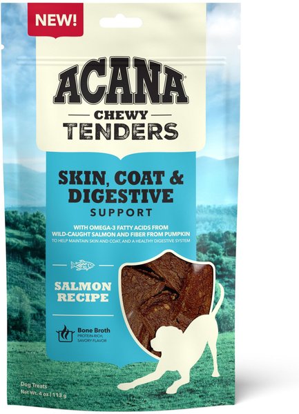 Treat your pup to some tender loving care with ACANA Chewy Tenders Salmon Dog Treats. The wag-worthy recipe features ingredients you can feel good about, including protein-rich, wild-caught salmon and bone broth along with pumpkin for gut-healthy fiber. Made with up to 85% animal ingredients, these treats deliver tummy tempting flavor and a burst of protein to fuel all your best friend’s adventures. A touch of sweet honey gives them a soft, chewy texture your dog will adore, while nutritious ingredients like omega-3 fatty acids and fiber help support your companion's skin, coat and digestive health. With no added fillers like soy, corn, tapioca or wheat, these are treats both you and your dog can get excited about!