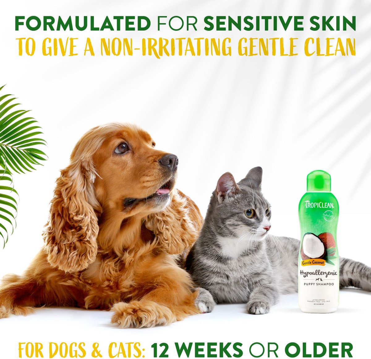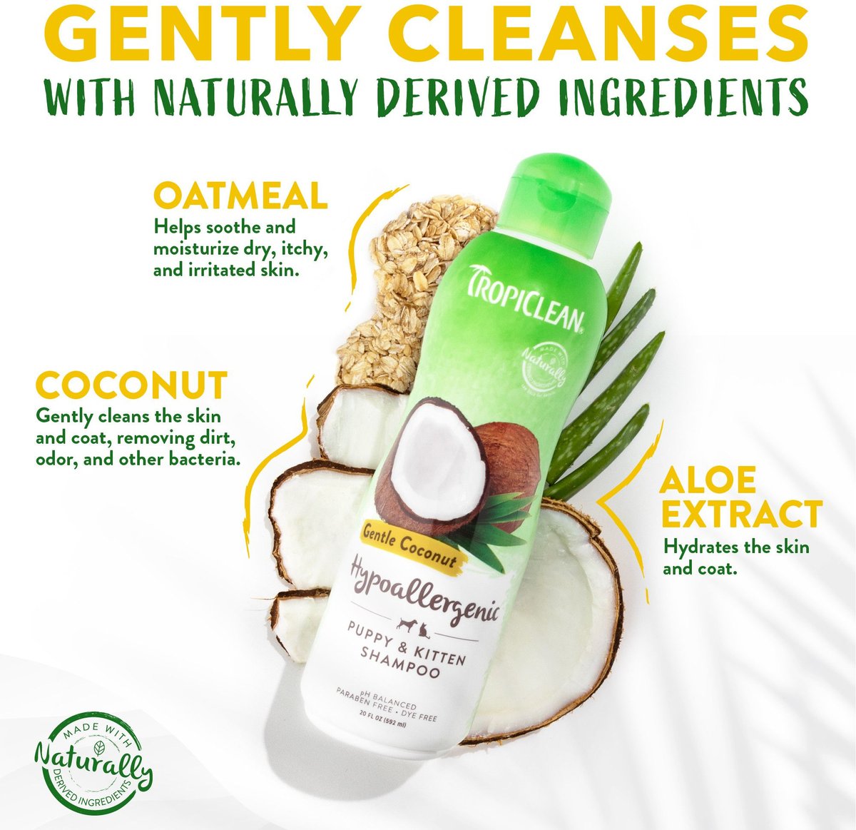 - TropiClean hypoallergenic shampoo is gentle enough for puppies and kittens with a moisturizing cleanse and a subtle, long-lasting coconut scent.