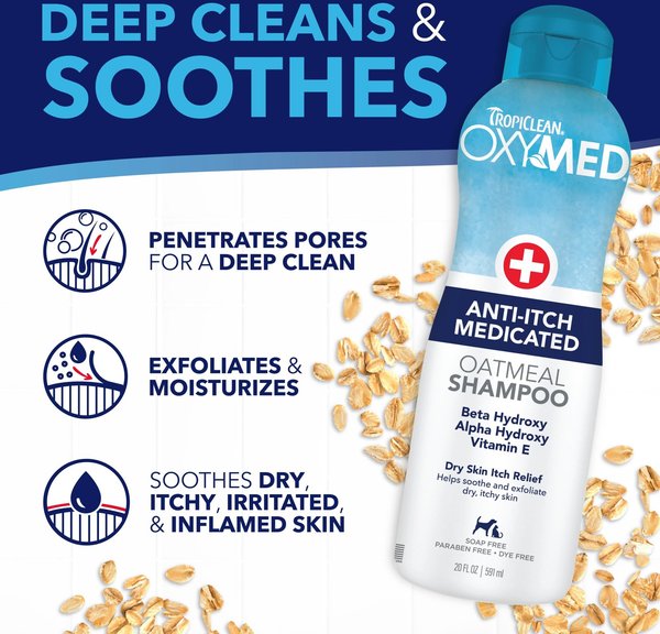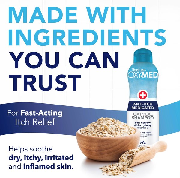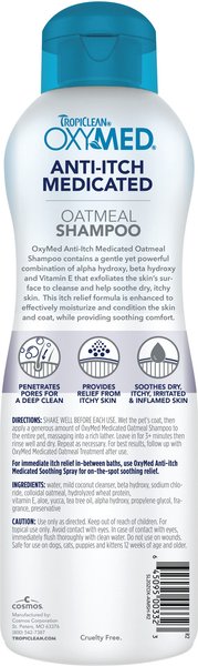 Is your furbaby constantly scratching? For fast-acting, soothing relief, try TropiClean OxyMed Medicated Anti-Itch Dog & Cat Shampoo. This vet-recommended formula goes beyond basic shampoos to provide a supportive, skin-healing clean. Alpha and beta hydroxy acids gently exfoliate the skin. They also penetrate deep inside the skin to alleviate itch and inflammation. OxyMed Medicated shampoo offers a safe and effective solution for dogs and cats dealing with hot spots, eczema, or general skin discomfort. Plus, it’s safe for sensitive skin and contains no soaps, parabens, or dyes. Whether your furry friend struggles with seasonal allergies or ongoing irritations, TropiClean is here to help. For comprehensive support, follow up with TropiClean OxyMed Medicated Itch Relief Dog & Cat Conditioner Treatment