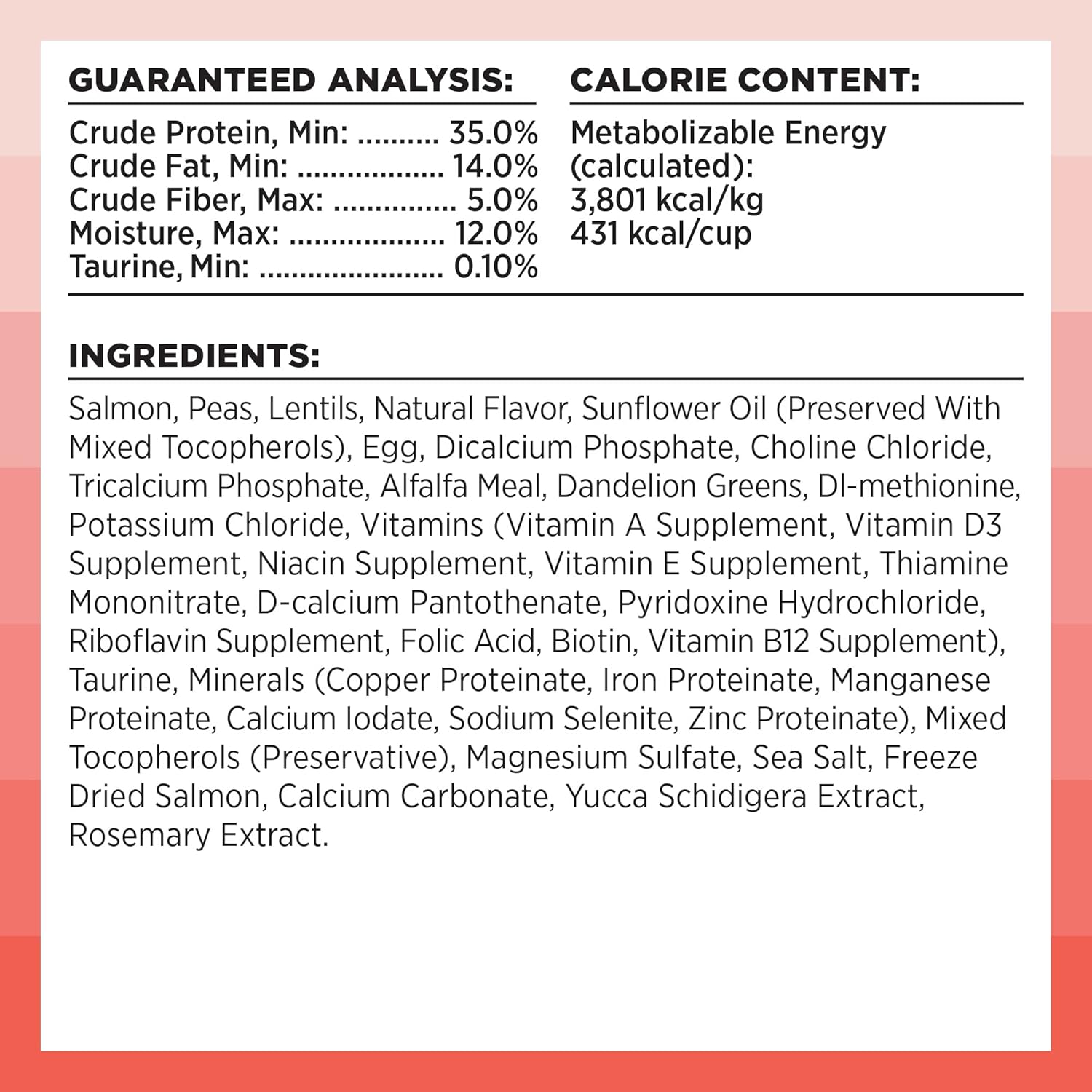 Salmon, Whole Yellow Peas, Dried Yeast, Lentils, Sunflower Oil, Natural Flavor, Dried Egg Product, Dicalcium Phosphate, Salt, Choline Chloride, Dehydrated Alfalfa Meal, Freeze-Dried Salmon, Vitamins (Vitamin E Supplement, Niacin Supplement, Thiamine Mononitrate, Vitamin A Supplement, Pyridoxine Hydrochloride, D-calcium Pantothenate, Riboflavin Supplement, Biotin, Vitamin B12 Supplement, Vitamin D3 Supplement, Folic Acid), Minerals (Zinc Proteinate, Iron Proteinate, Copper Proteinate, Manganese Proteinate, Sodium Selenite, Calcium Iodate), Inulin, Taurine, Mixed Tocopherols (a preservative), Yucca Schidigera Extract, Rosemary Extract