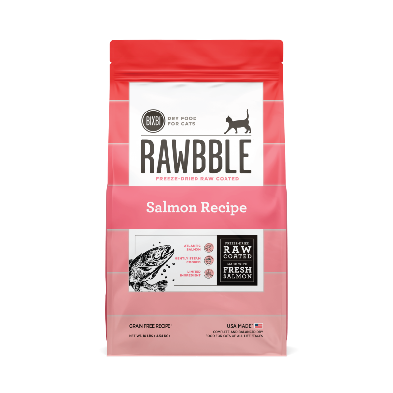 The Hunt For Fresh Meat Kibble Is Over. For cats that thrive on a protein-rich diet, Rawbble Dry Food for Cats Salmon Recipe is made in the USA with Atlantic salmon and has added prebiotics to support digestion. Each meal offers the perfect balance of nutrients and is freeze-dried raw coated for purr-worthy flavor.