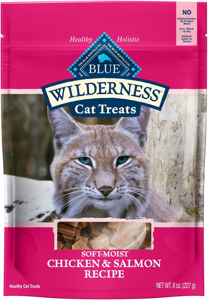 BLUE Wilderness Chicken & Salmon soft-moist cat treats are the perfect way to cater to your feline's inner carnivore. Loaded with real chicken and salmon, these soft-moist cat treats have the flavor your cat craves. BLUE Wilderness cat treats are: