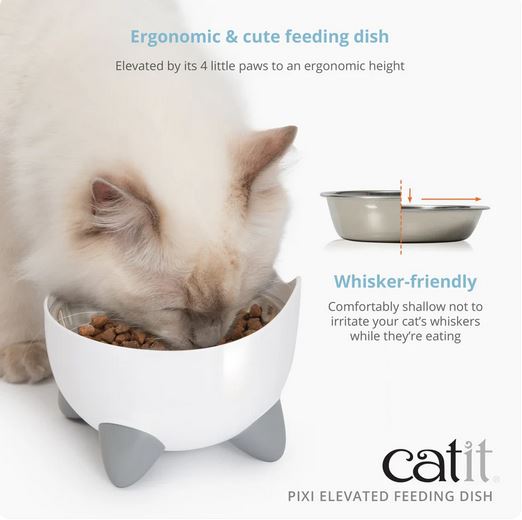 The Catit PIXI Elevated Feeding Dish is great for serving any type of cat food. This feeding dish is elevated to a comfortable height, and specially designed so your cat’s sensitive whiskers don’t repeatedly touch the sides as they eat.