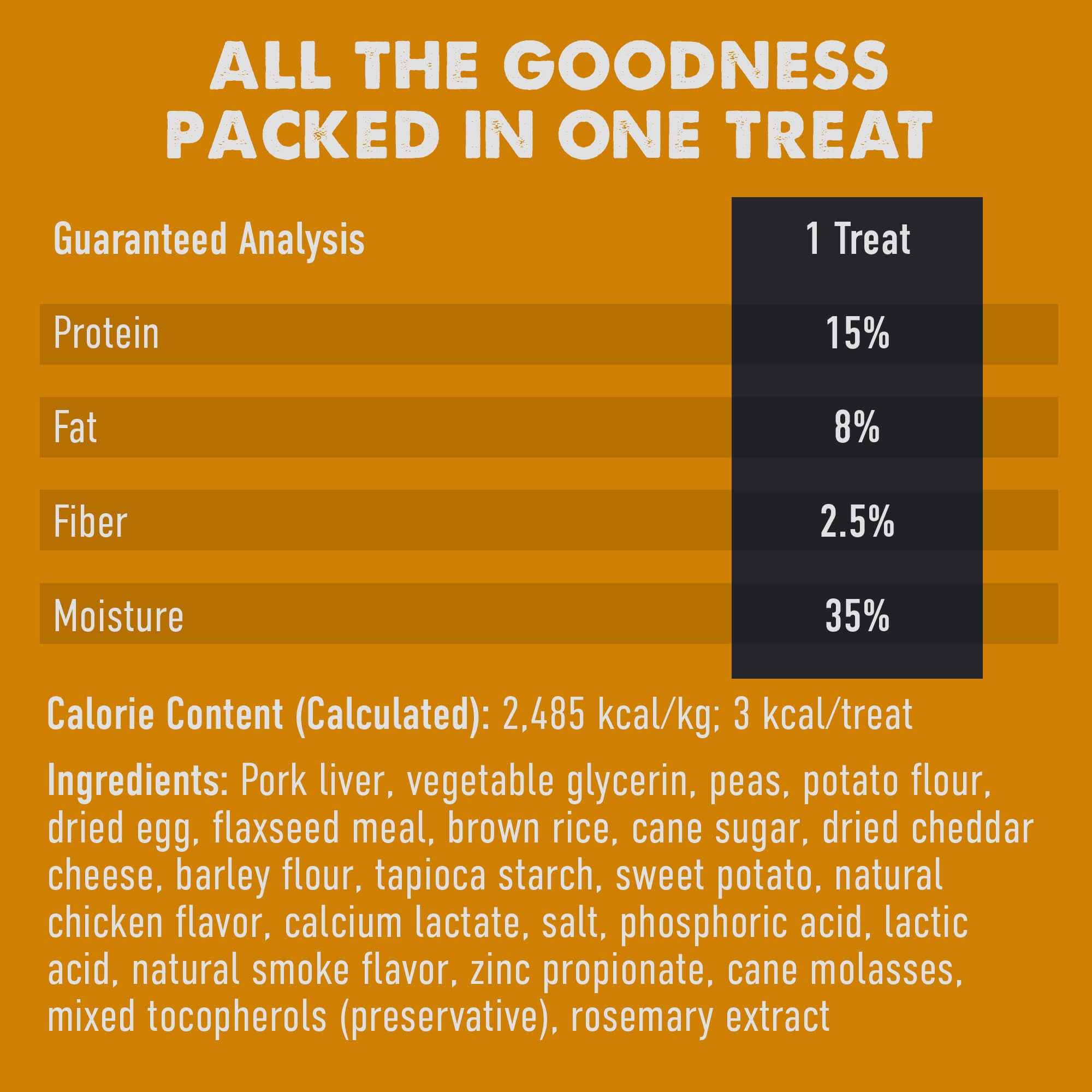Pork liver, vegetable glycerin, peas, potato flour, dried egg, flaxseed meal, brown rice, cane sugar, dried cheddar cheese, barley flour, tapioca starch, sweet potato, natural chicken flavor, calcium lactate, salt, phosphoric acid, lactic acid, natural smoke flavor, zinc propionate, cane molasses, mixed tocopherols (preservative), rosemary extract