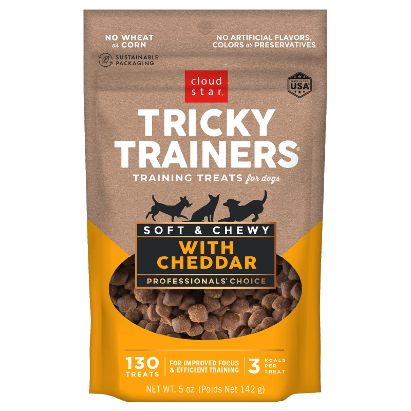 Motivate your pup to be on his best behavior with Cloud Star Tricky Trainers Soft & Chewy Dog Treats. Tricky Trainers feature an irresistible smell and flavor to capture your dog’s attention. The thoughtful formula is low in calories, so your pup won’t fill up during longer training sessions. Each bite features a deliciously soft and chewy texture that dogs drool for. Plus, they contain no corn, wheat, artificial colors, or artificial flavors. With wholesome ingredients like real cheddar cheese, you can feel good about rewarding your pal’s good behavior—during training time or anytime!