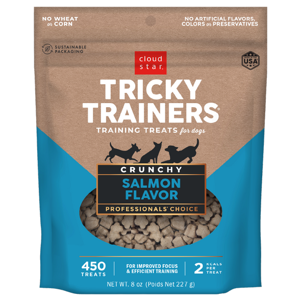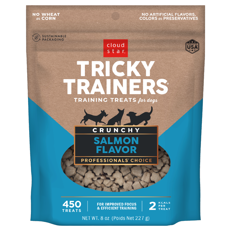 Motivate your pup to be on his best behavior with Cloud Star Tricky Trainers Crunchy Dog Treats. Tricky Trainers feature an irresistible smell and flavor to capture your dog’s attention. The thoughtful formula is low in calories, so your pup won’t fill up during longer training sessions. Each bite features a deliciously crunchy texture that dogs drool for. Plus, they contain no corn, wheat, artificial colors, or artificial flavors. With wholesome ingredients like real salmon, you can feel good about rewarding your pal’s good behavior—during training time or anytime!