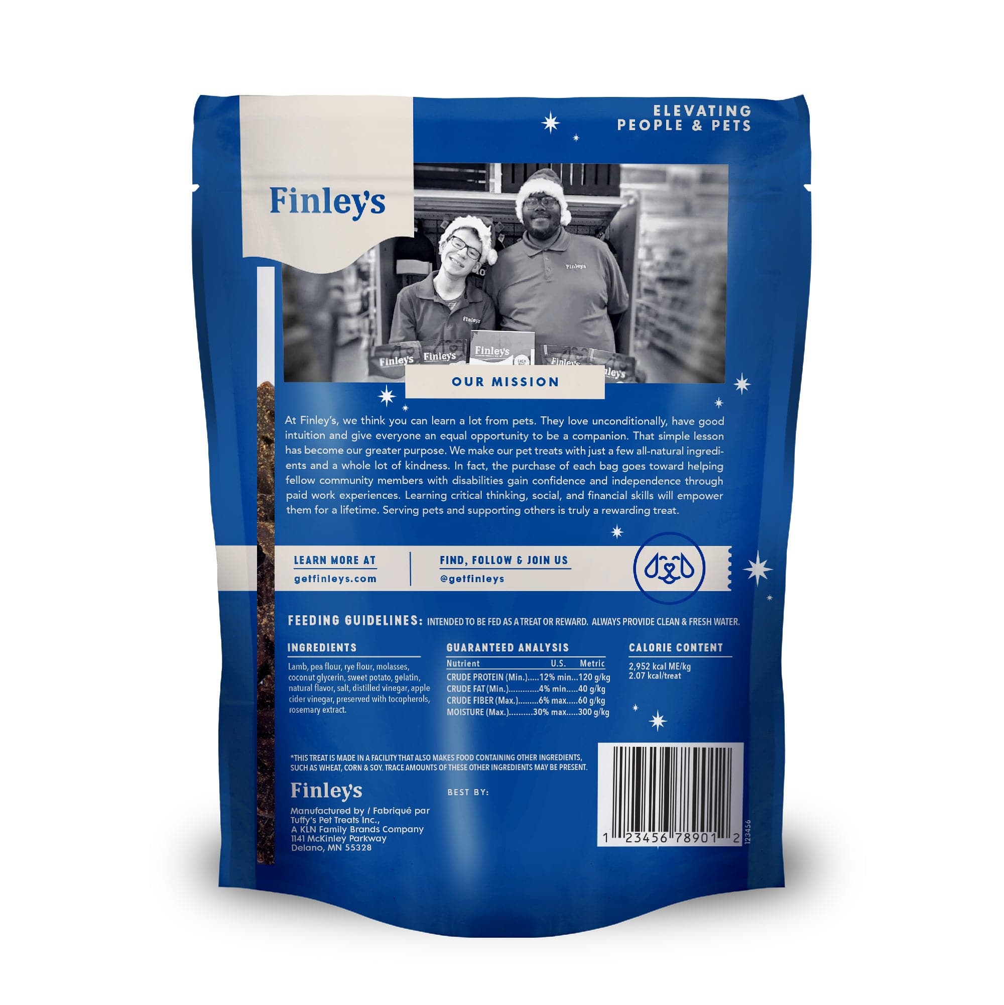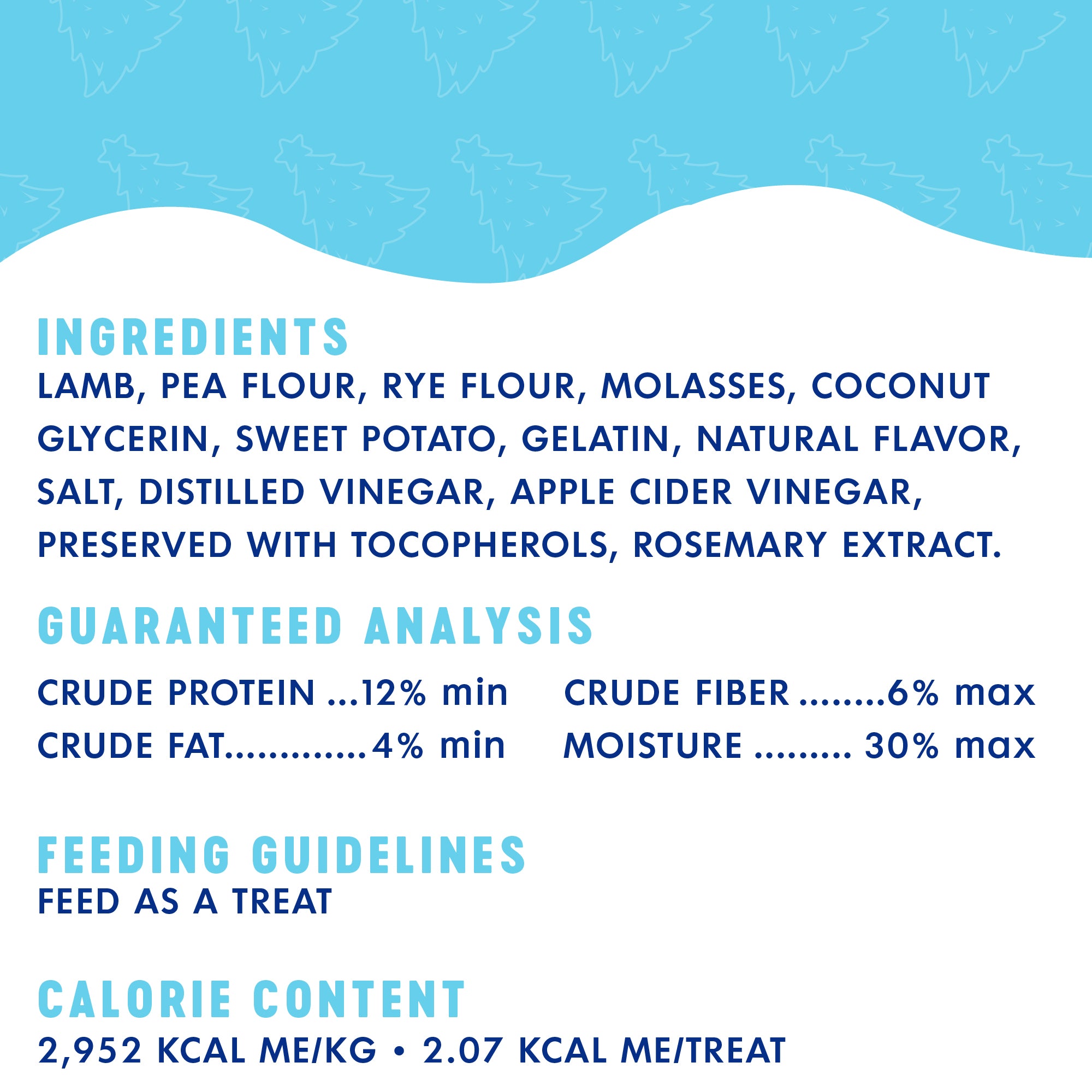 Lamb, pea flour, rye flour, molasses, coconut glycerin, sweet potato, gelatin, natural flavor, salt, distilled vinegar, apple cider vinegar, preserved with tocopherols, rosemary extract.
