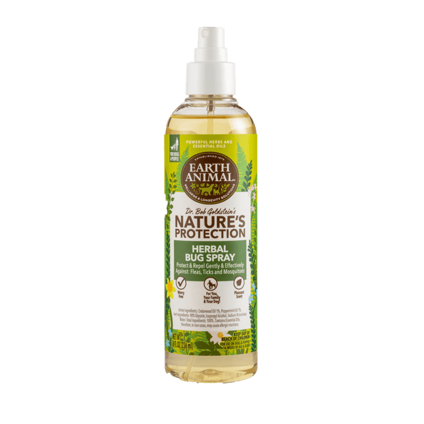 Formulated by Dr. Bob Goldstein, our Nature's Protection™ Flea & Tick Herbal Bug Spray is infused with a natural blend of aromatic herbs and essential oils that have a fresh, minty fragrance. The preventative powder and minty scent of these gentle oils are non-offensive to people and dogs, but loathed by fleas, ticks, and mosquitoes. Our spray is great for hikes, long walks, romps on the beach, boating, or simply lazy days in the yard. We suggest spraying the paws, underbelly, and gently mist the back and neck, daily. You should reapply if your dog swims. Shake well before use to activate the oils. The spray is safe for people too, especially kids, if used as directed.