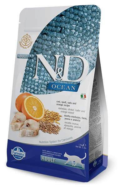 N&D Cod, spelt, oats and orange recipe is formulated to meet the nutritional levels established by the AAFCO Cat Food Nutrient Profiles for maintenance.