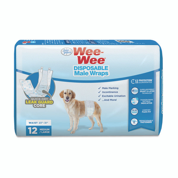 Wee-Wee Disposable Male Wraps are a clean and easy solution for solving male marking, incontinence, excitable urination, and more! Featuring Super-Absorbent Smart 6-Layer Technology, these dog male wraps have a soft and breathable rapid-dry liner that keeps your furry friend clean and comfortable throughout the day. In the middle, the Quick-Dry Leak Guard Core is made of multiple layers and quickly turns liquid into gel. The final layer locks away moisture to prevent leaks and is guaranteed to provide 12 hours of protection! Designed with ultimate comfort and protection in mind, these wraps for male dogs include double-stitched elastic to ensure a snug and flexible fit around your dog's waist. Fur-friendly fasteners allow you to readjust the wrap as needed without irritating your dog's coat. To let you know when it's time for a new wrap, the Fashion Paws Wetness Indicator blue pawprint pattern will fade when wet. Great for puppy training, traveling, or any other instance of unexpected urination, each absorbent male dog wrap will keep your dog dry and your home clean!