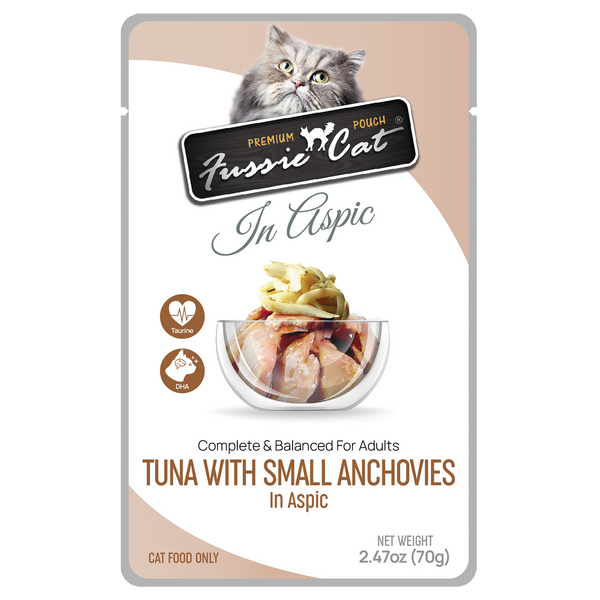 Introducing our newest line to the Fussie Cat family, Fussie Cat Premium Pouches! Our new line of gourmet cat food has a high moisture content to help support daily hydration needs. Being rich in DHA and Omega 3 Fatty Acids not only helps support healthy skin and shiny coat but helps support brain and vision development as well. Fussie Cat Premium Pouches are a Complete and Balanced diet for adult cats and are available in many whisker-licking formulas.