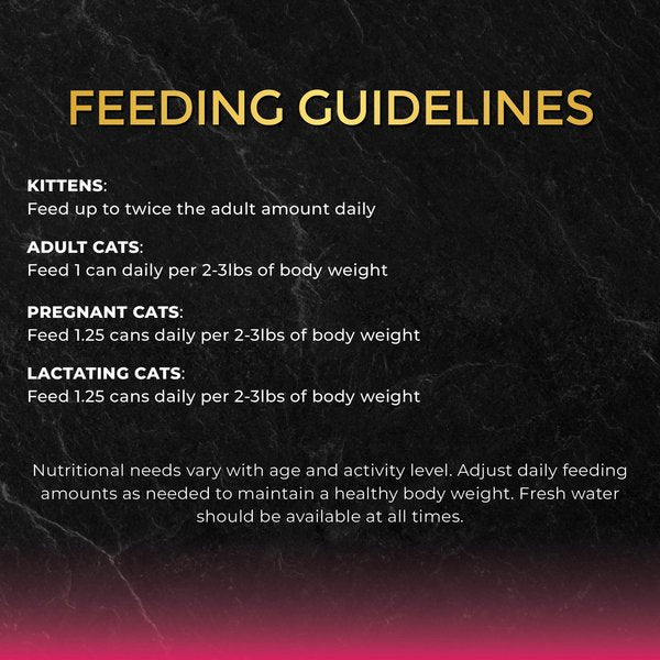 Kittens: Feed up to twice the adult amount daily Adult Cats: Feed 1 can daily per 2 - 3 lbs of body weight Pregnant Cats: Feed 1.25 can daily per 2 - 3lbs of body weight Lactating Cats: Feed 3 cans daily per 2 - 3lbs of body weight Nutritional needs vary with age and activity level. Adjust daily feeding amounts as needed to maintain a healthy body weight. Fresh water should be available at all times.