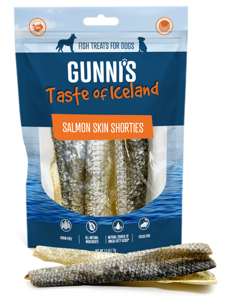 Our Salmon Skin Shorties are super tasty dog chews made from from 100% salmon skin strips. Each strip is 3-5" in length and full of flavor that your dog will adore. Each strip is loaded with Omega 3 & 6 Omega essential fatty acids. Your dogs are going to absolutely love this healthy treats!