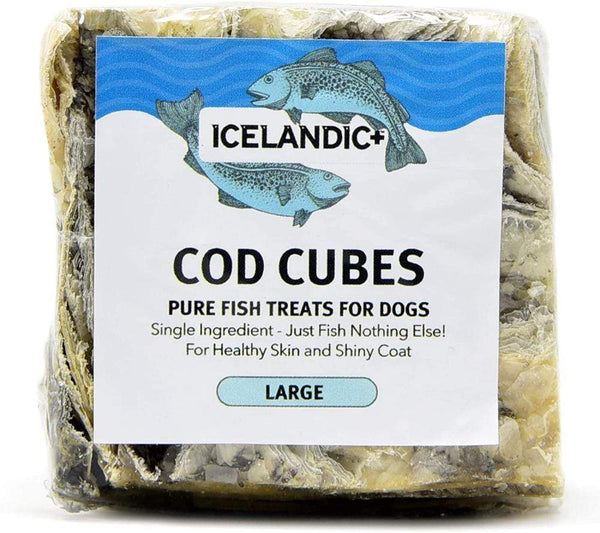 Our 100% natural and edible Icelandic Cod Skin Large Cube is a single ingredient dog treat and contains no additives, preservatives or supplements. The Large Cube is dense and is a bit larger than 2"x 2"x 2" (6cm x 6cm x 6cm) They come only from the pure icy waters of Iceland and are line-caught daily and processed immediately. Not only are they delicious for your dog, they reduce tartar and plaque build-up for healthier gums and teeth. They are also a great natural source of Omega-3 fatty acids, promoting healthy skin and coat for your pet. With just one ingredient, these tasty and healthy treats are perfect for dogs with protein sensitivities. Our natural and edible fish products offer peace of mind, as they are cleaned and air-dried within FDA, USDA, EU, and MAST standards and regulations. Because Iceland almost never gets warm, our fish always remain cold after being caught. As a result, they have less smell than other fish treats in the market.