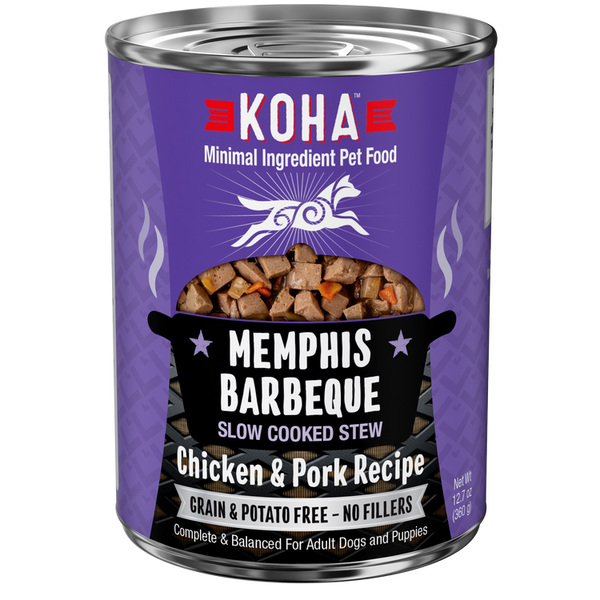 KOHA Memphis Barbeque Slow Cooked Stew provides a nutritious high-quality protein combination that is grain, potato, and carrageenan free. Dogs rock ‘n roll to the savory taste of tender chicken and pork. Feed as a complete and balanced meal or as a topper.
