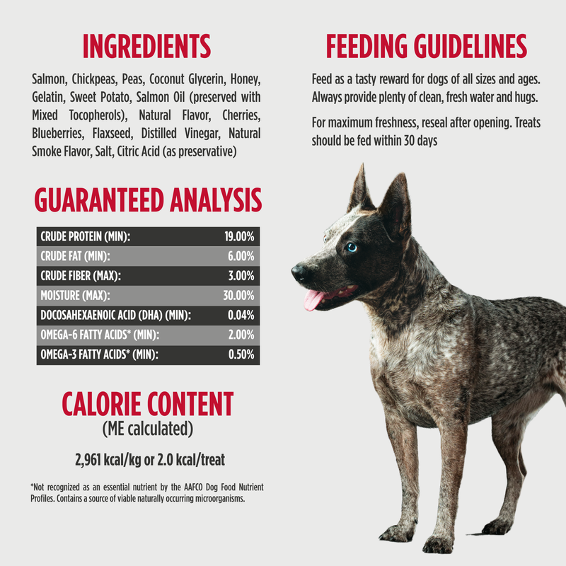 Salmon, Chickpeas, Peas, Coconut Glycerin, Honey, Gelatin, Sweet Potato, Salmon Oil (preserved with Mixed Tocopherols), Natural Flavor, Cherries, Blueberries, Flaxseed, Distilled Vinegar, Natural Smoke Flavor, Salt, Citric Acid (as preservative).