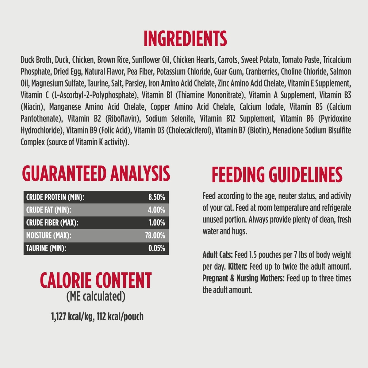 Duck Broth, Duck, Chicken, Brown Rice, Sunflower Oil, Chicken Hearts, Carrots, Sweet Potato, Tomato Paste, Tricalcium Phosphate, Dried Egg, Natural Flavor, Pea Fiber, Potassium Chloride, Guar Gum, Cranberries, Choline Chloride, Salmon Oil, Magnesium Sulfate, Taurine, Salt, Parsley, Iron Amino Acid Chelate, Zinc Amino Acid Chelate, Vitamin E Supplement, Vitamin C (L-Ascorbyl-2-Polyphosphate), Vitamin B1 (Thiamine Mononitrate), Vitamin A Supplement, Vitamin B3 (Niacin), Manganese Amino Acid Chelate, Copper Amino Acid Chelate, Calcium Iodate, Vitamin B5 (Calcium Pantothenate), Vitamin B2 (Riboflavin), Sodium Selenite, Vitamin B12 Supplement, Vitamin B6 (Pyridoxine Hydrochloride), Vitamin B9 (Folic Acid), Vitamin D3 (Cholecalciferol), Vitamin B7 (Biotin), Menadione Sodium Bisulfite Complex (Source Of Vitamin K Activity).