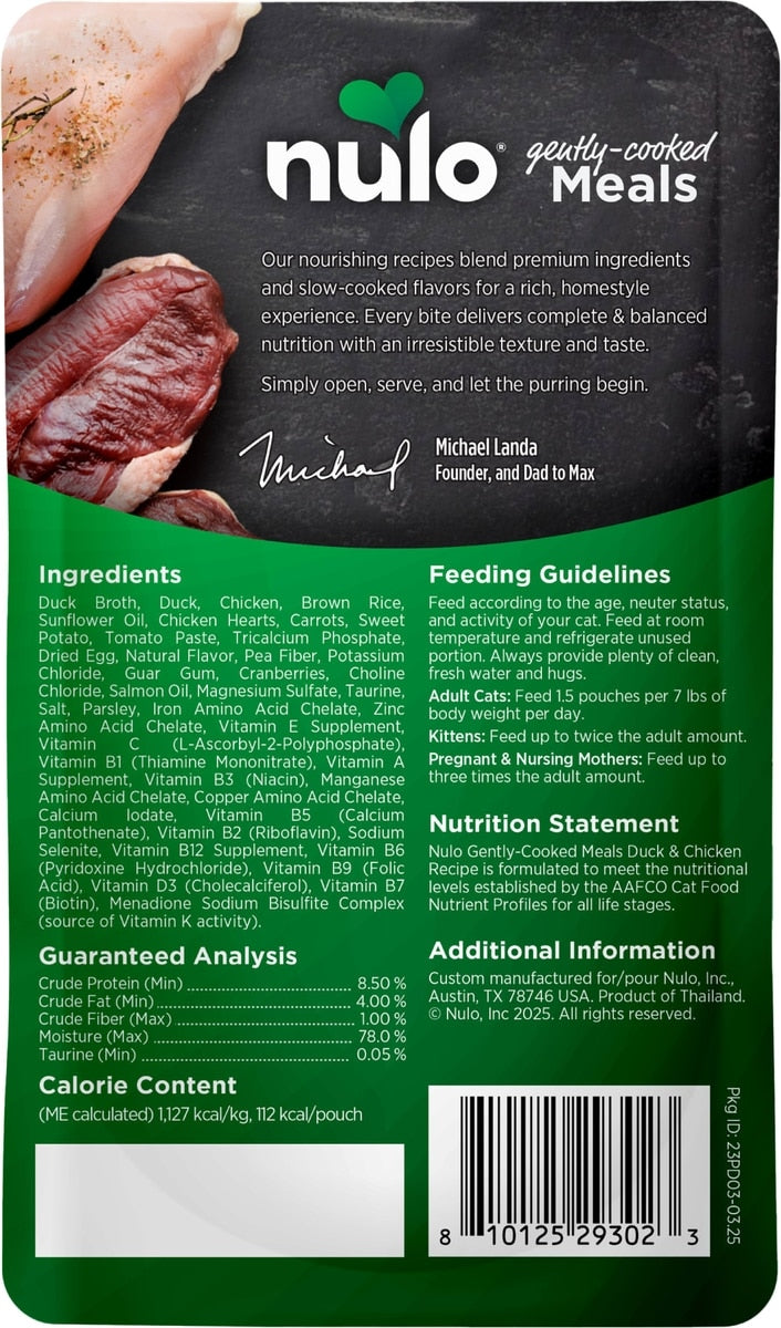 Serve your favorite feline a delicious and nutritious meal they’ll adore with Nulo Gently Cooked Meals Duck & Chicken Wet Cat Food. This wet cat food features real chicken and duck gently cooked in duck broth, then blended with wholesome grains and salmon oil for a rich flavor even picky eaters will love. Minimal processing helps ensure the nutrient benefits are retained to provide the complete and balanced nourishment your kitty needs to thrive. Plus, it’s made to be easy to serve, so you can quickly give your BFF a homestyle meal you can feel good about.