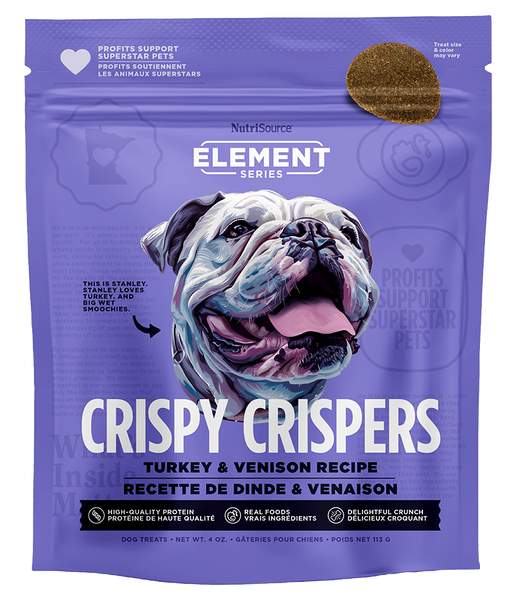NutriSource Element Series Turkey & Venison Crispy Crispers are made with high-quality protein. Real foods that dogs love in a treat make these totally satisfying!
