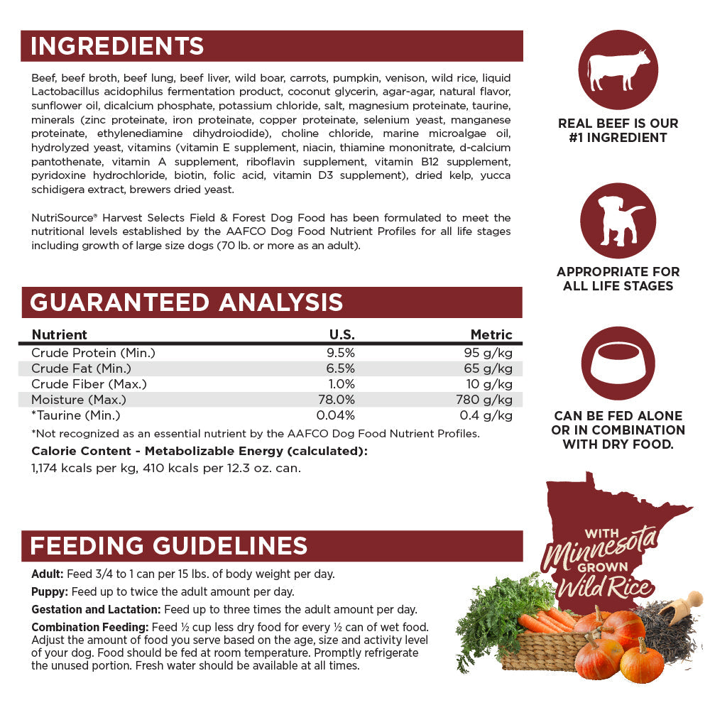 NutriSource Harvest Selects Field & Forest dog formula is a holistically formulated, easy-to-digest pate canned food, now powered by Come-Pooch-A postbiotics. We combine beef, wild boar, and venison with Minnesota grown wild rice, pumpkin, and carrot. We also utilize our Alltech Good 4 Life supplements by adding highly digestible minerals & potent prebiotics and probiotics to promote growth and support immunity and health for your special friend. Health starts here!