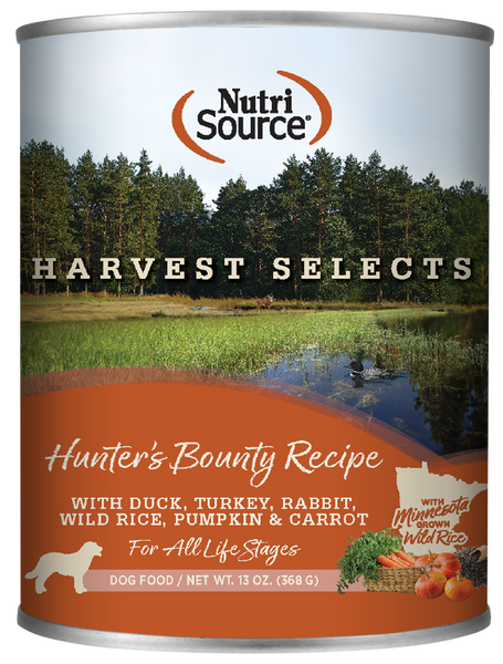 NutriSource Harvest Selects Hunter's Bounty dog formula is a holistically formulated, easy-to-digest pate canned food, now powered by Come-Pooch-A postbiotics. We combine duck, turkey, and rabbit with Minnesota grown wild rice, pumpkin, and carrot. We also utilize our Alltech Good 4 Life supplements by adding highly digestible minerals & potent prebiotics and probiotics to promote growth and support immunity and health for your special friend. Health starts here!