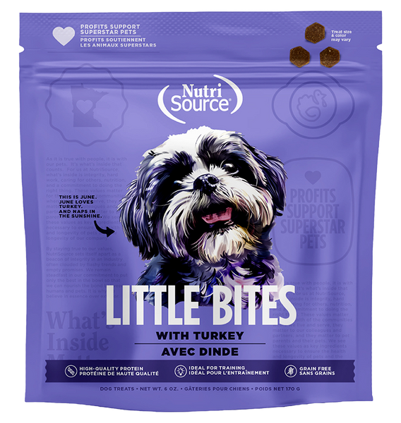NutriSource Turkey Grain Free Little Bites are made with high-quality protein. Real foods that dogs love in a treat make these totally satisfying!