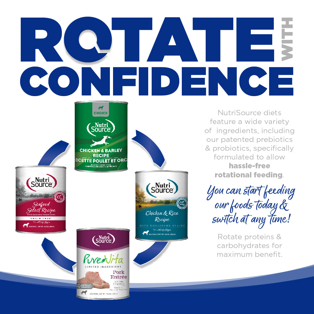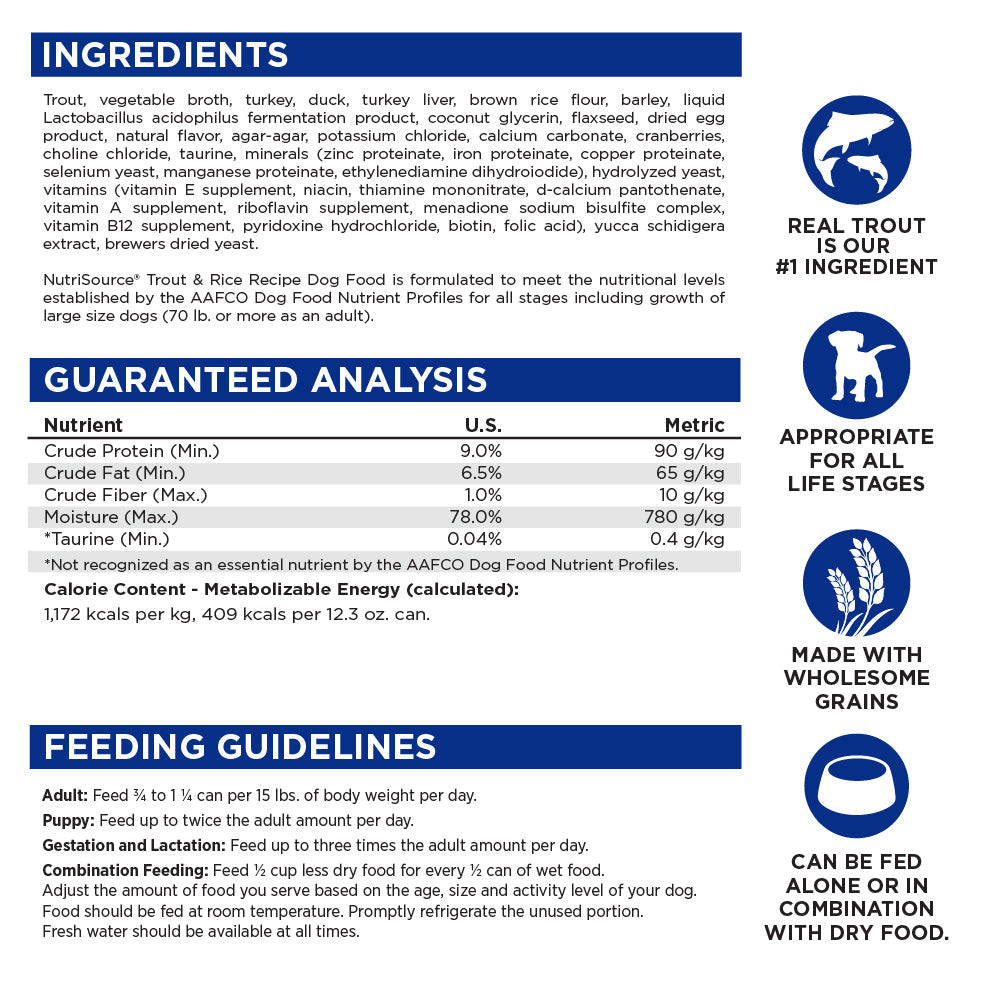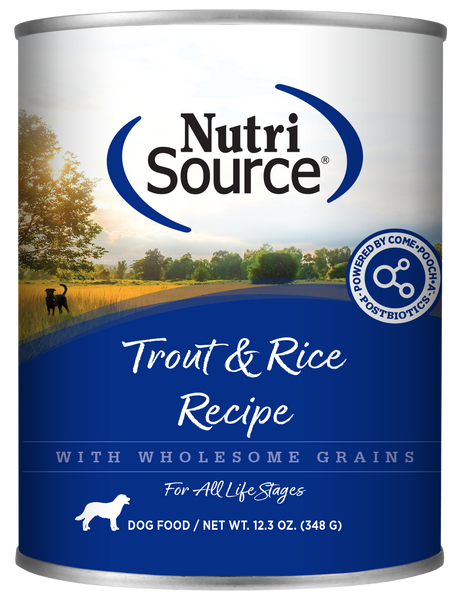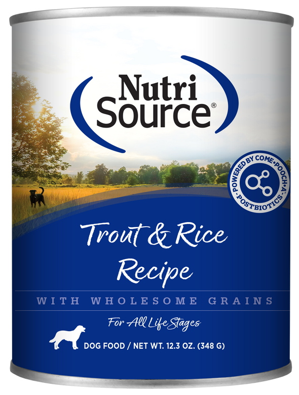 NutriSource Trout and Rice Pate-Style dog formula is a holistically formulated, easy-to-digest pate canned food, now powered by Come-Pooch-A postbiotics. We combine tasty trout, duck and turkey with premium brown rice and carefully selected holistic ingredients. We also utilize our Alltech Good 4 Life supplements by adding highly digestible minerals & potent prebiotics and probiotics to promote growth and support immunity and health for your special friend. Health starts here!