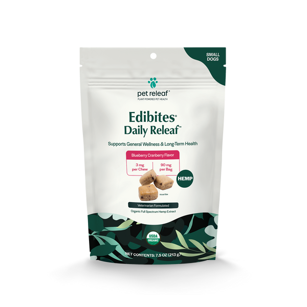 Our Daily Releaf Small Breed Edibites were created to support your small dog’s overall long-term health.