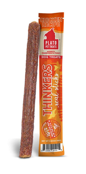 Thinkers Chicken are hearty, meat-packed sticks with added EPA and DHA to support healthy brain function. Made with real chicken as the 1st ingredient, these treats are made with limited ingredients, are naturally preserved, and contain no artificial flavors, corn, wheat, or soy. Because of their large size, Thinkers offer substantial chewing satisfaction or can be broken into smaller pieces to create multiple treats. And we take the extra time to air-dry them in batches in our USA facility instead of baking them in order to retain more of the ingredients’ inherent nutrients (but your dog will just think that they smell and taste amazing). It takes longer, but we think its worth it. Thinkers also come in Salmon, Duck and Lamb.