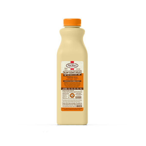 Our Pumpkin Spice Raw Goat Milk features organic pumpkin and ginger for fiber and to support digestion. It’s also packed with vitamins, minerals, and electrolytes that help dogs and cats live in their prime. Pouring Raw Goat Milk over your pet’s favorite food is a nutrient-rich way to add vital moisture and digestion-supporting probiotics to their diet. Made with milk sourced from certified humanely raised goats.