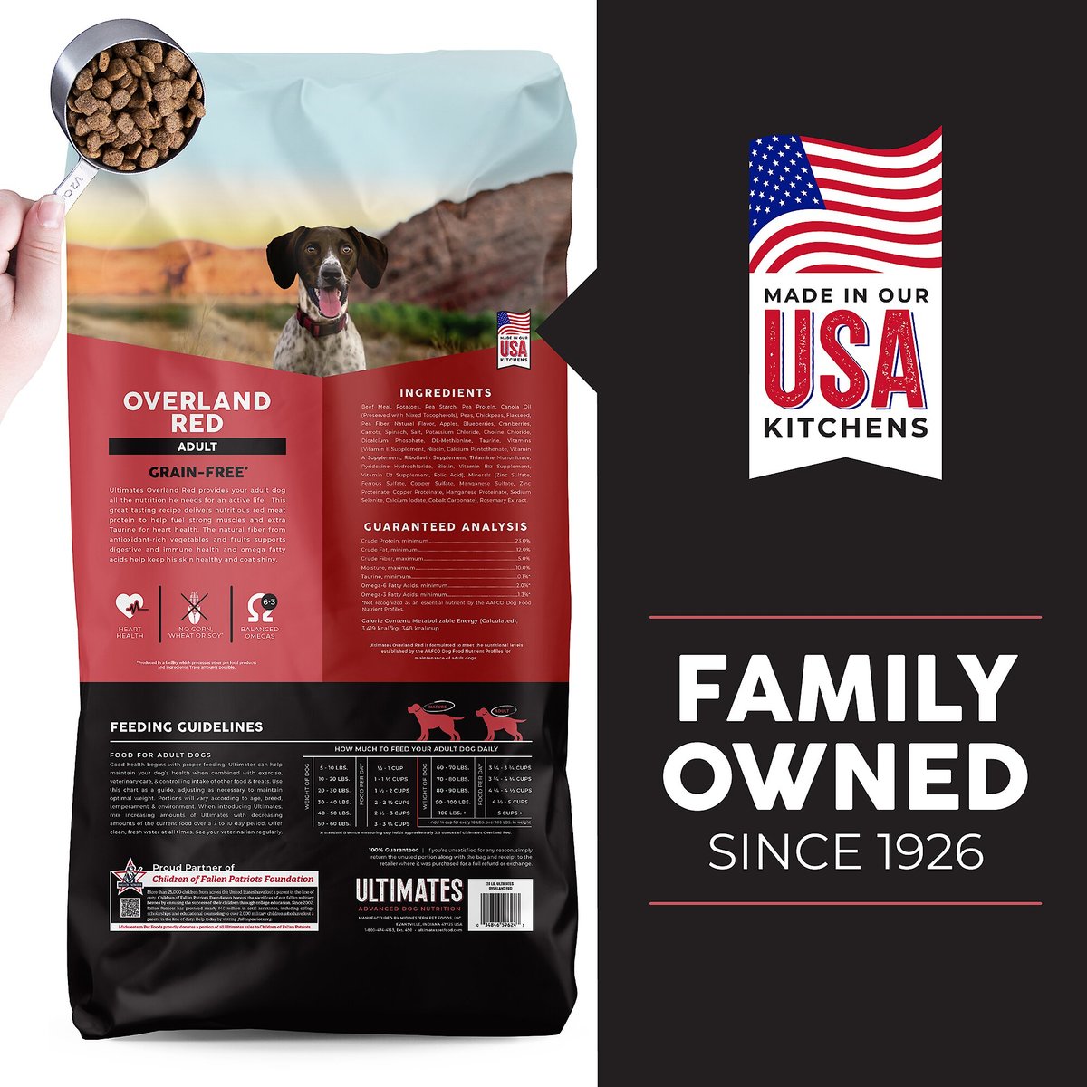 Taking care of your dog’s overall health starts by feeding him properly. We suggest using this chart as a guide. Adjust amounts accordingly over time. Please remember these portions are averages and will vary according to age, activity, size and temperament of your Adult dog. Pregnant and lactating female dogs will require 2 - 3 times as much food as Adult feeding guidelines shown. When switching to a new food, gradually increase the new food and decrease the old food over a 7 - 10 day period of time until your pet is completely eating Ultimates™ Overland Red™. Transition Instructions: On days 1 & 2 of the change, you should have plenty of your pet's old food left. Fill the bowl with 3 quarters of the old food, and one quarter of Ultimates. On days 3 & 4, add in another quarter, so you have half old food, half Ultimates. On days 5 & 6, mix one quarter old food and 3 quarters Ultimates . On only 7 days, your pet will be on an all-new diet of Ultimates.