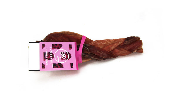 Roosevelt Braided Bully is made from Free Range/Grass Fed Bulls to create a healthy high-quality chew. They are a great source of digestible protein. Braided bully sticks give your dog a task, alleviates boredom, and satiates their need to chew. And because they’re braided, they tend to be tougher and last longer.