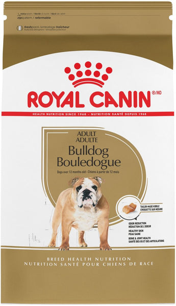 Royal Canin Breed Health Nutrition Bulldog Adult Dry Dog Food is tailor-made nutrition created just for your Bulldog pure breed. Whether you call yours an English Bulldog or British Bulldog, this exclusive breed-specific diet is uniquely formulated for your mid size dog with specific nutrients to help him thrive. The wave-shaped specialized kibble is designed for your medium breed’s unique jaw, making it easy for him to pick up and chew. Highly digestible proteins, precise fiber content, and high-quality carbohydrates support gut health to decrease gas and unpleasant odors while promoting optimal stool quality. Exclusive nutrients provide skin care and reinforce your Bulldog’s skin barrier to help protect skin folds from irritants and maintain a healthy coat. And optimal levels of EPA and DHA provide joint and bone support, while helping your Bulldog maintain an ideal weight.