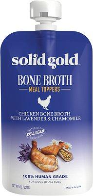 Add a nutrient-rich and delicious flavor to your pup's meal when you add Solid Gold Chicken Bone Broth with Lavender & Chamomile Dog Food Topper. This delectable topper is made with real, human grade chicken bone broth and is rich in naturally occurring collagen, as well as vitamins and minerals essential for overall wellness. Added lavender and chamomile provide an aromatic and flavorful treat that even the pickiest eaters will love. Plus, this broth is easy for pet parents to use-simply add two tablespoons to your dog's food as a tasty topper, use to moisten dry food for dogs with sensitive teeth, add to water for added flavor and to encourage proper hydration or serve on its own as a tasty treat.