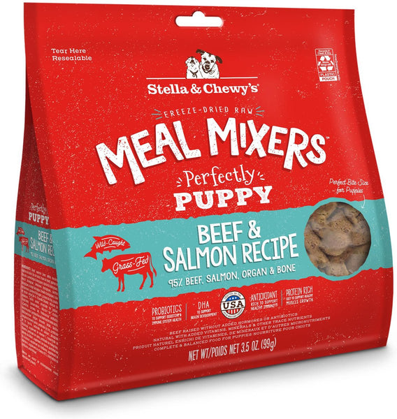 Feed your canine as nature intended with Stella & Chewy’s Freeze Dried Raw Meal Mixers Grain Free Protein Rich Beef & Salmon Recipe Dog Food. This raw-inspired recipe is simple. Each batch of Meal Mixers for dogs starts with at least 90% real meat, organs and bone and is often a single source of animal protein—the perfect solution for pets with food sensitivities. Each protein is grass-fed, cage-free or wild caught and mixed with 100% organic produce to mimic your dog's wild diet. Easy for canines of all ages to digest, this nutritious recipe contains no grains or unnecessary fillers. Crafted with care in the USA.