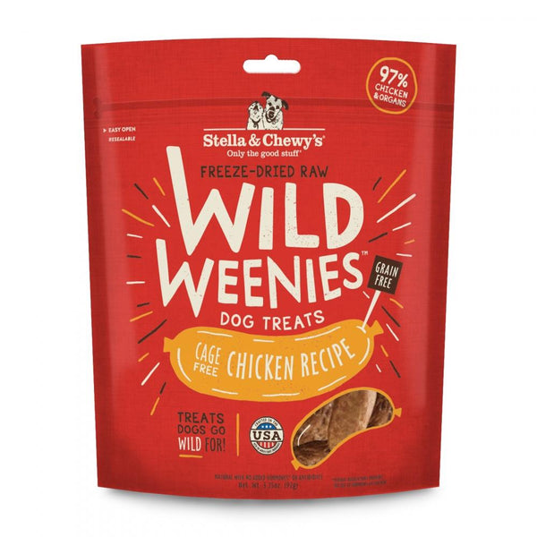 Stella & Chewy's Freeze-Dried Raw Chicken Wild Weenies Dog Treats are made with a cage-free chicken recipe in the USA. Wild Weenies are grain-free, gluten-free and include no artificial ingredients. Stella and Chewy's was built on a philosophy that feeding your pet a wholesome diet similar to what their ancestors enjoyed in the wild is the optimal way to help your pet thrive. These treats offer real raw nutrition & taste your dog will go wild for!