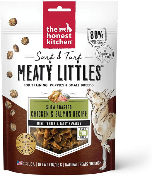 The Honest Kitchen believes the best way to get your pup to sit, stay or just behave is with super tasty, human grade treats! Our Surf & Turf Meaty Littles combine lots of cage free chicken and wild caught salmon to deliver a super craveable taste with an extra helping of protein to support strong muscles and DHA for optimal brain health. Perfect for training, treating and toys, your pup will flip for these tender bits of goodness.