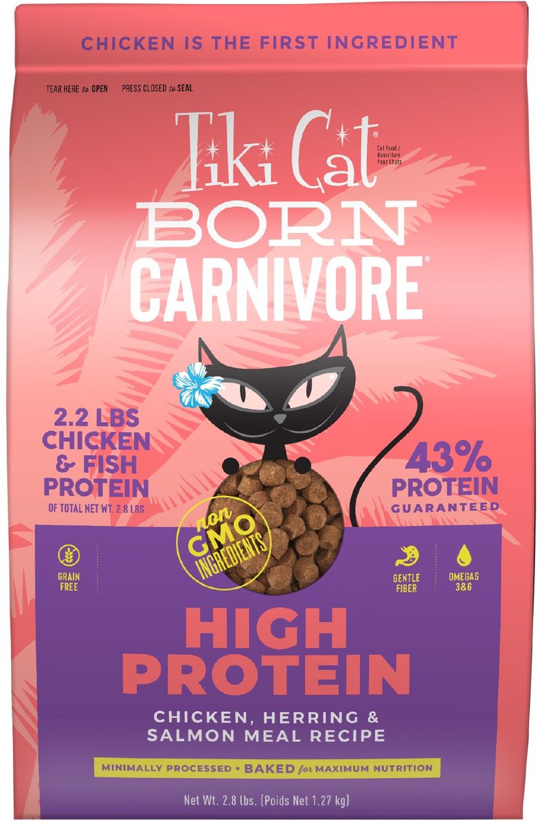 Satisfy your feline friend’s carnivorous cravings with Tiki Cat Born Carnivore Chicken & Herring Grain-Free Dry Cat Food. This purr-worthy crunchy, baked kibble is crafted with real meat and fish and contains more than 47% protein with 80% from animal sources, nutritionally mimicking your feline friend’s natural prey diet. And you’ll be paw-leased to know that all the ingredients in this high-protein, low-carb recipe are non-GMO!