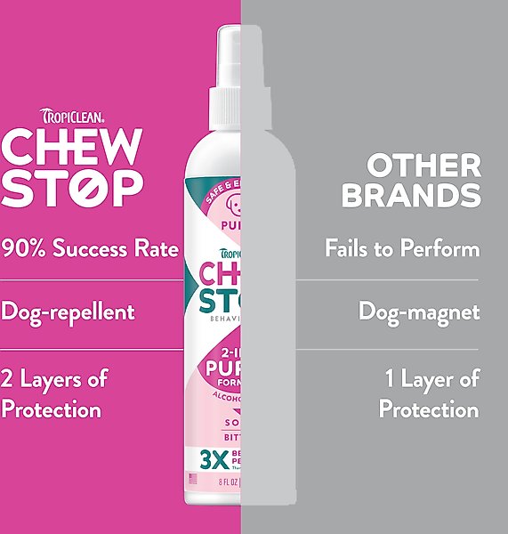 Pet parents, say goodbye to destructive chewing and hello to well-behaved puppies with TropiClean Chew Stop Puppy Deterrent Spray. This natural and non-toxic solution is scientifically proven to deter unwanted behaviors by using a double-layered protection of bitter and sour tastes. With easy application and safe for everyday use, it’s the perfect tool for gentle and effective training. Plus, it’s three times more effective than other products on the market, making it a must-have for every puppy training toolkit.