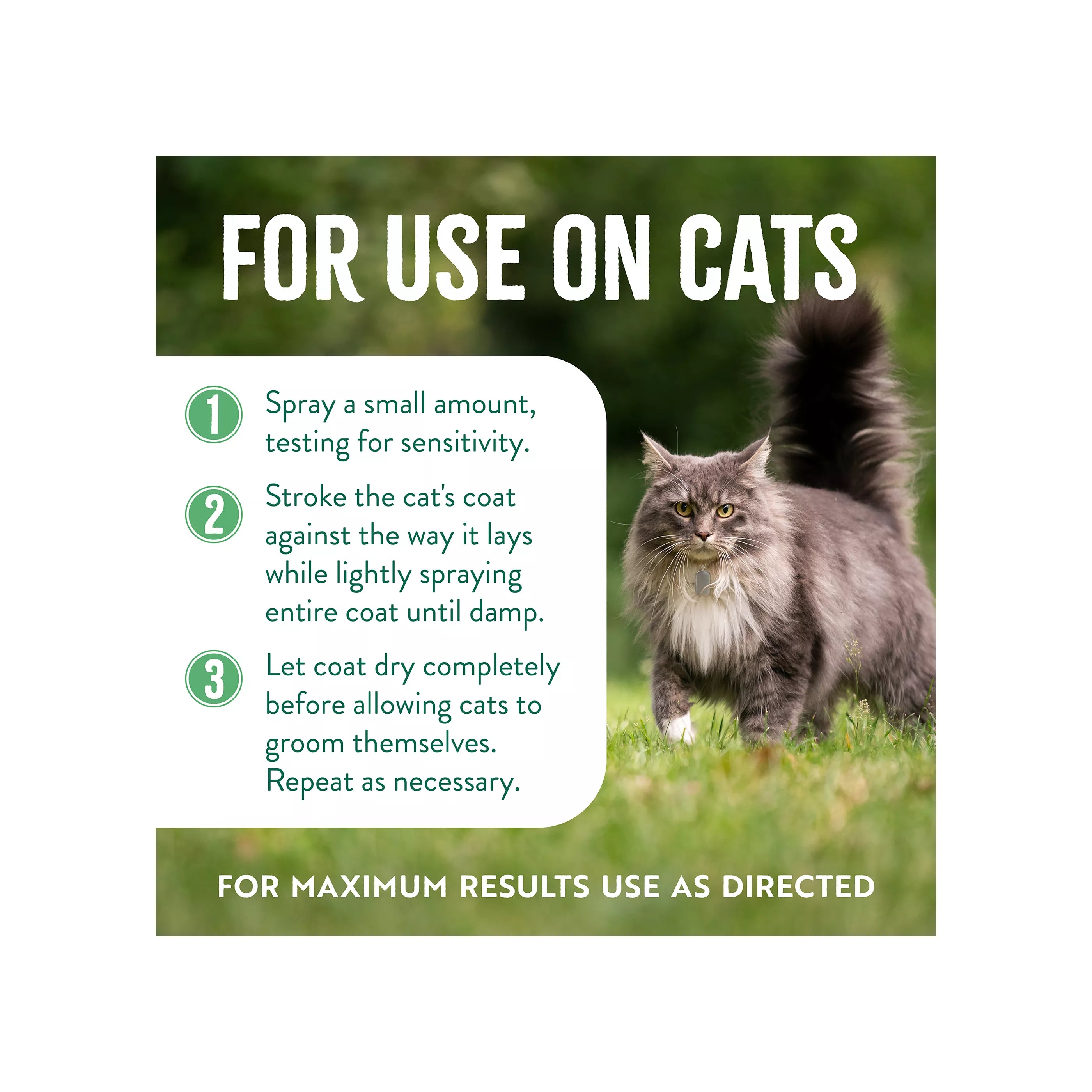 Sensitivity may occur with the use of any product on individual cats. Spray a small amount on the cat, observing for any signs of sensitivity for one hour. Thereafter: Stroke the cat's coat against the way it lays while lightly spraying entire coat including legs, tail, and stomach until the solution reaches the skin and it is slightly damp, but not dripping. Do not spray in the face, eyes, or genitals. Let coat dry completely before allowing cats to groom themselves to minimize incidental ingestion.