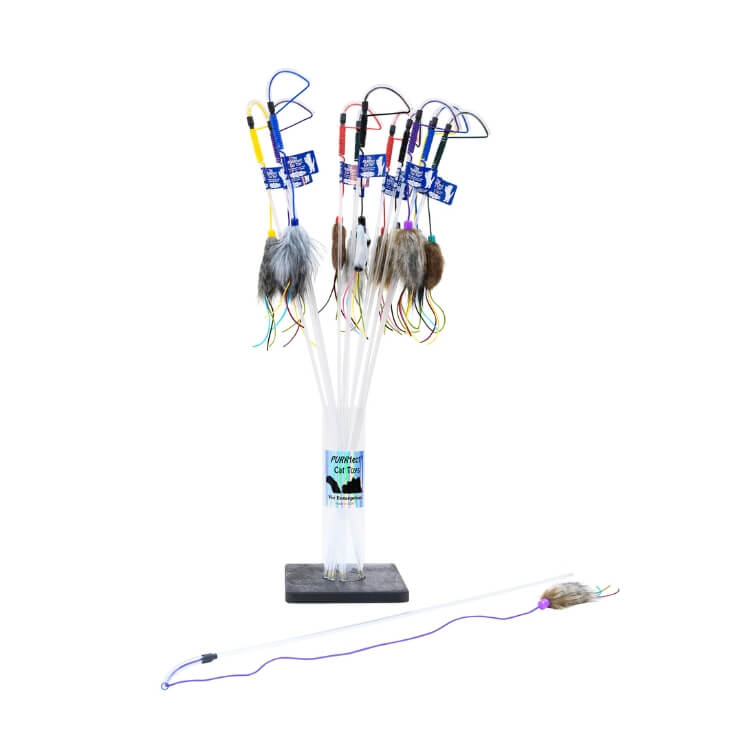 The PURRfect Cat Toy by Vee Enterprises is the original wand toy for fun and interaction with your feline! It has a 32 Inch flexible and durable wand, with "noise-maker" bb's built in for added interest. The multicolored plush faux animal "lure" has satin tails and is attached to a 36 Inch reinforced woven cord.