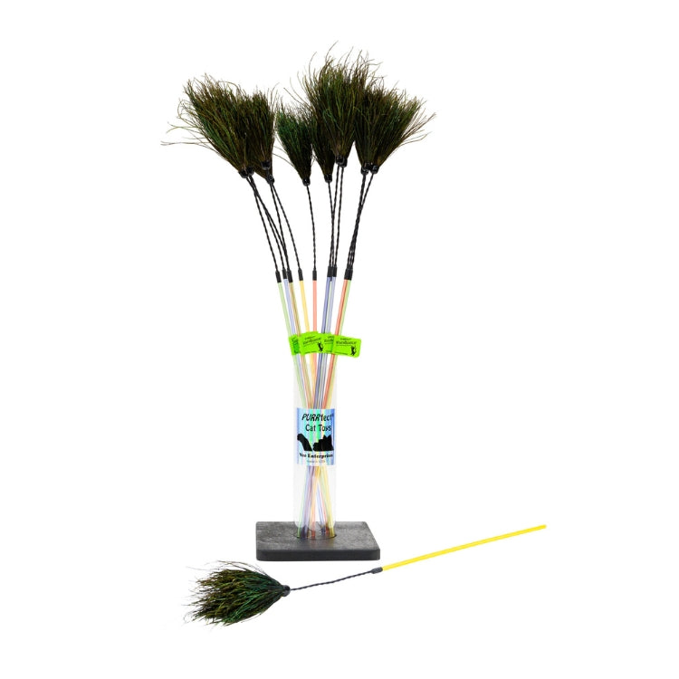 The PURRfect Wispy Bouncer features iridescent peacock feathers and tear-resistant plastic for hours of durable play! Your cat will have a blast batting at these colorful feathers! Scent alone will drive your pet bonkers! Other features include an 18 in. clear colored wand and a 6 in. springy flex cable. Makes the perfect toy for spending some quality bonding time with your kitty! Made in USA.