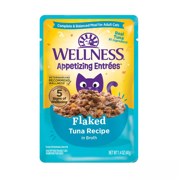 Make mealtime something your kitty will look forward to with Wellness Appetizing Entrees Tuna Natural Grain-Free Flaked Wet Cat Food. These crave-worthy meals are specially formulated for adult cats, and they are packed with high-quality ingredients to support your furry friend’s overall health. The natural recipe is specially formulated to support the five signs of wellbeing in cats, with real protein as the number one ingredient and no carrageenan, artificial flavors, preservatives, or colors. Plus, feeding your cat this high-moisture wet food is an easy way to promote healthy hydration every day. It’s a choice both you and your cat can agree upon!