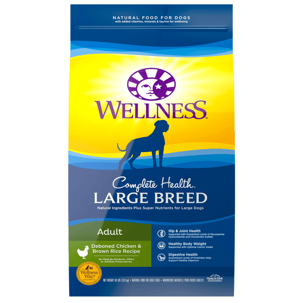Large breed dogs love a hearty, meaty meal! So let's give them what they want, with Wellness Complete Health Natural Large Breed Adult Chicken and Brown Rice Recipe. With 13% more protein than Wellness Complete Health Adult Recipe, it's formulated specifically for large breeds. With just the right amount of nutrients, minerals, phosphorous, glucosamine, chondroitin, and calcium, maintaining strong bones just got easier. With four sources of protein to maximize the nutrient absorption and help your large breed dog build lean muscle, it's meatier than ever, and packed full of flavor.