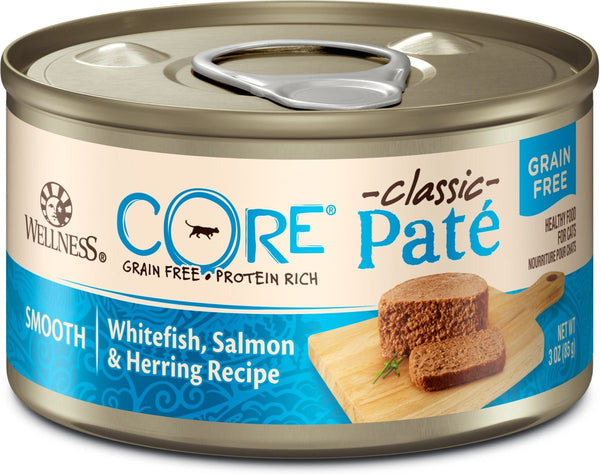 Wellness CORE Grain Free Natural Salmon, Whitefish & Herring Recipe Wet Canned Cat Food is a seafood wonderland in a can your cat will never forget! This protein-dense recipe will make your cat’s coat shine like never before. Omega 3 fatty acids help moisturize the skin as well as aid in shining your cat’s coat which in turn helps lower the amount of hairballs. Also, this recipe has delicious dried ground potatoes which is a strong source of vitamin a that helps your cat have good vision and eye health, as well as a strong immune system.