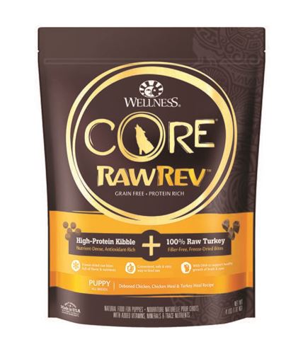 Wellness CORE RawRev Puppy Deboned Chicken, Chicken Meal & Turkey Meal Recipe with Freeze Dried 100% Raw Turkey Bites allows you to add raw easily and safely to every meal. This recipe contains optimal protein, calcium and phosphorus to support healthy bone and muscle growth, along with DHA to support brain and eye development. High-protein, grain free kibble is combined with 100% raw meat pieces to create a savory, nutrient-rich meal packed with everything your puppy needs to thrive from the CORE.