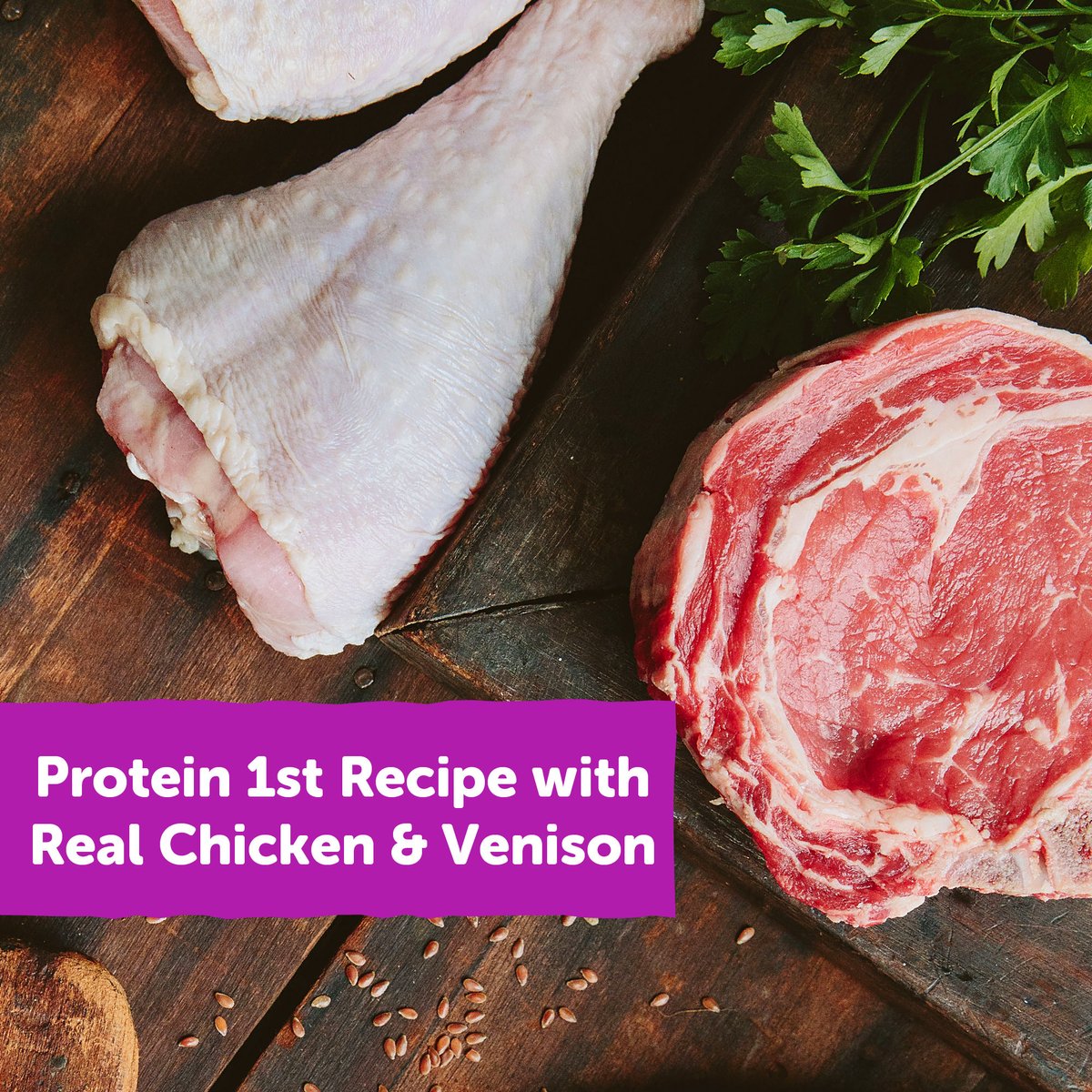 - Made with real chicken as the first ingredient followed by venison, chickpeas, carrots, blueberries, and more.