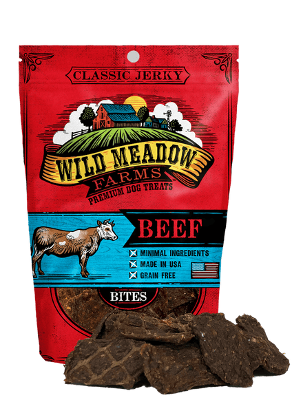 Our Wild Meadow Farms Classic Jerky Bites use the same recipes as our Classic Jerky Minis, but are crafted in a larger size that is great for everyday treating. They are also soft enough to tear into the perfect size for dogs of all ages and stages. Give your dog these high quality, meaty Classic Jerky Bites, and know that you are treating them right!