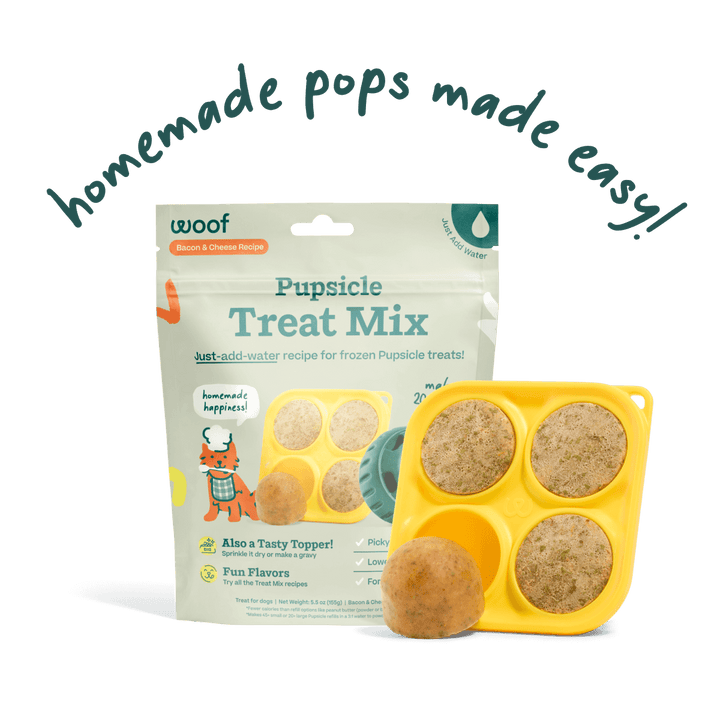 Treat your pup to a delicious and enriching snack with Woof’s Pupsicle Treat Mix Bacon & Cheese Lickable Dog Treats. This lickable treat formula is designed to pair perfectly with the Pupsicle (sold separately), making it easy for pet parents to keep treat time exciting. Simply mix the formula, freeze it in the Pupsicle Treat Tray (sold separately), and watch your pup enjoy a tasty and engaging distraction. Plus, Treat Mix can also be used as a flavorful meal topper, adding extra appeal to your dog’s daily meals.