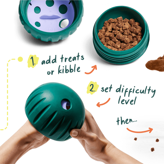 - Unscrew lid and add Woof Puzzle Treats.
